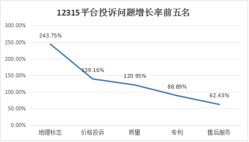 与2024年上半年相比,增长较快的问题有地理标志(上升243.75%)、价格投诉(上升139.16%)、质量(上升120.95%)、专利(上升88.89%)、售后服务(上升62.43%)。