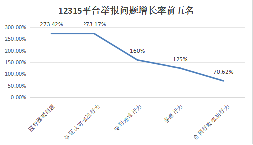 与去年上半年相比,增长较快的问题有医疗器械问题(上升273.42%)、认证认可违法行为(上升273.17%)、专利违法行为(上升160%)、垄断行为(上升125%)、合同行政违法行为(上升70.62%)。