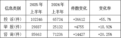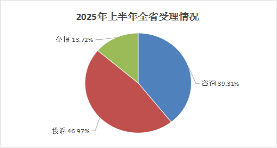 2025年上半年,全省市场监管12315工作机构通过全国12315平台共接收各类投诉举报咨询217896件,同比上升34.42%,环比上升24.4%。其中,投诉102346件,占受理总量的46.97%,同比上升55.7%,环比上升48.28%;举报29887件,占受理总量的13.72%,同比上升18.92%,环比上升9.61%;咨询85663件,占受理总量的39.31%,同比上升20.25%,环比上升8.61%。投诉案件中,为消费者挽回经济损失3642.15万元,涉及争议金额15637.67万元。详见下图: