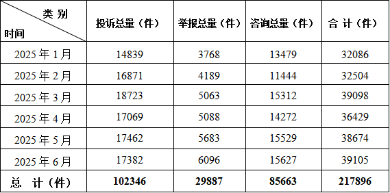 2025年上半年,从全省市场监管各级12315工作机构月受理消费者诉求情况看,每月投诉、举报、咨询平均受理量36316条,其中一月份受理诉求量最小,为32086件;六月份受理诉求量最大,为39105件。上半年投诉举报咨询整体增长的原因是太原、大同、朔州、忻州、吕梁、晋中、临汾7个市12315平台与12345热线平台去年年底对接后所致。