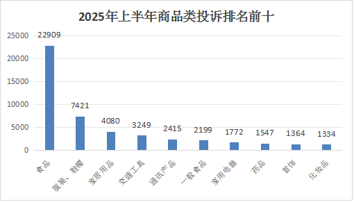 2025年上半年,商品类投诉排名前三位的热点依次为:食品类、服装鞋帽类、家居用品类,排位顺序与2024年上半年一致。详见下图: