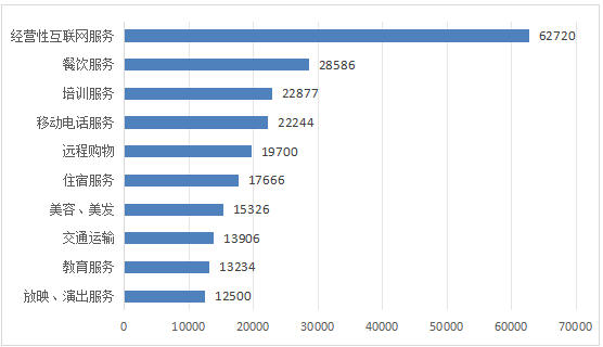 在具体服务投诉中,投诉量居前五位的分别为(如图5所示)经营性互联网服务、餐饮服务、培训服务、移动电话服务、远程购物。与2024年上半年相比,交通运输、教育服务、放映演出服务投诉量上升明显,移动电话服务、住宿服务投诉量有所下降。