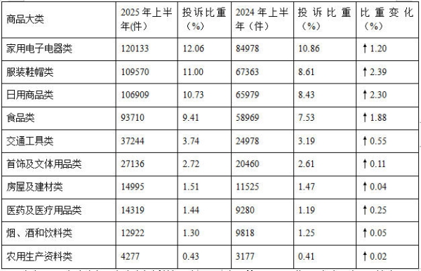 根据2025年上半年商品大类投诉数据(如图2、表2所示),家用电子电器类、服装鞋帽类、日用商品类、食品类、交通工具类投诉量居前五位。与2024年上半年相比,服装鞋帽类、日用商品类投诉比重上升。